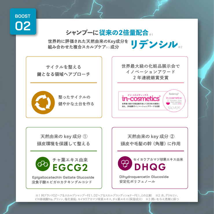 リデンシルは、世界的評価を受ける天然由来成分「EGCG2(チャ葉エキス由来)」「EHQG(セイヨウアカマツ球果エキス由来)」を組み合わせた複合スカルプケア成分。毛髪の土台となる頭皮に働きかけて、健やかな状態に導きます。リデンシルは、2014年に開催された世界最大の化粧品原料展示会「In-cosmetics」にて、イノベーションゾーンベストアワード「銀賞」を受賞しています。