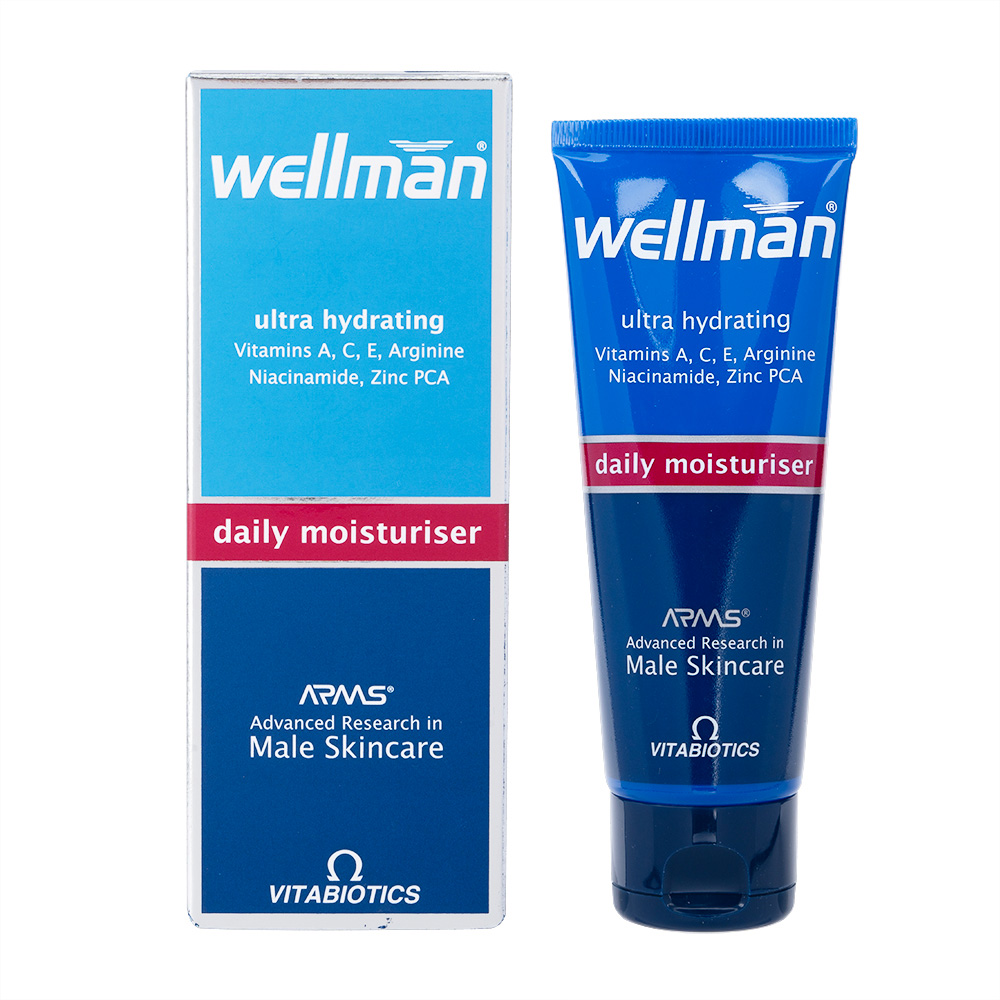 VITABIOTICS(ビタバイオティクス)のウェルマン デイリーモイスチャライザーは、男性用の保湿剤です。高保湿タイプです。ビタミンA、C、E、アルギニン、ナイアシンアミド、PCA亜鉛などを配合しています。12時間続く保湿作用で肌に潤いを与え、目立つ小じわをケアします。また、肌に栄養を与え、なめらかさに働きかけます。イギリス製です。