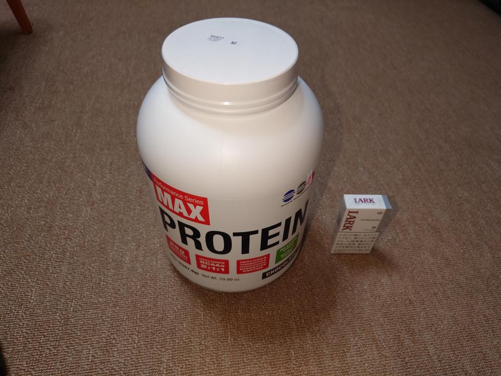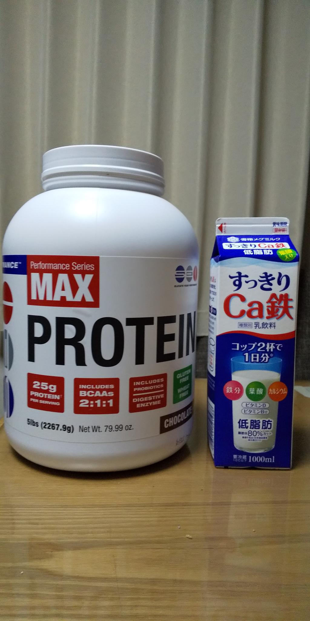 初めてのプロテイン。よくプロテインはマズイとか言われるけど、このチョコ味は水でも牛乳でもまぁまぁ美味しく飲めます。