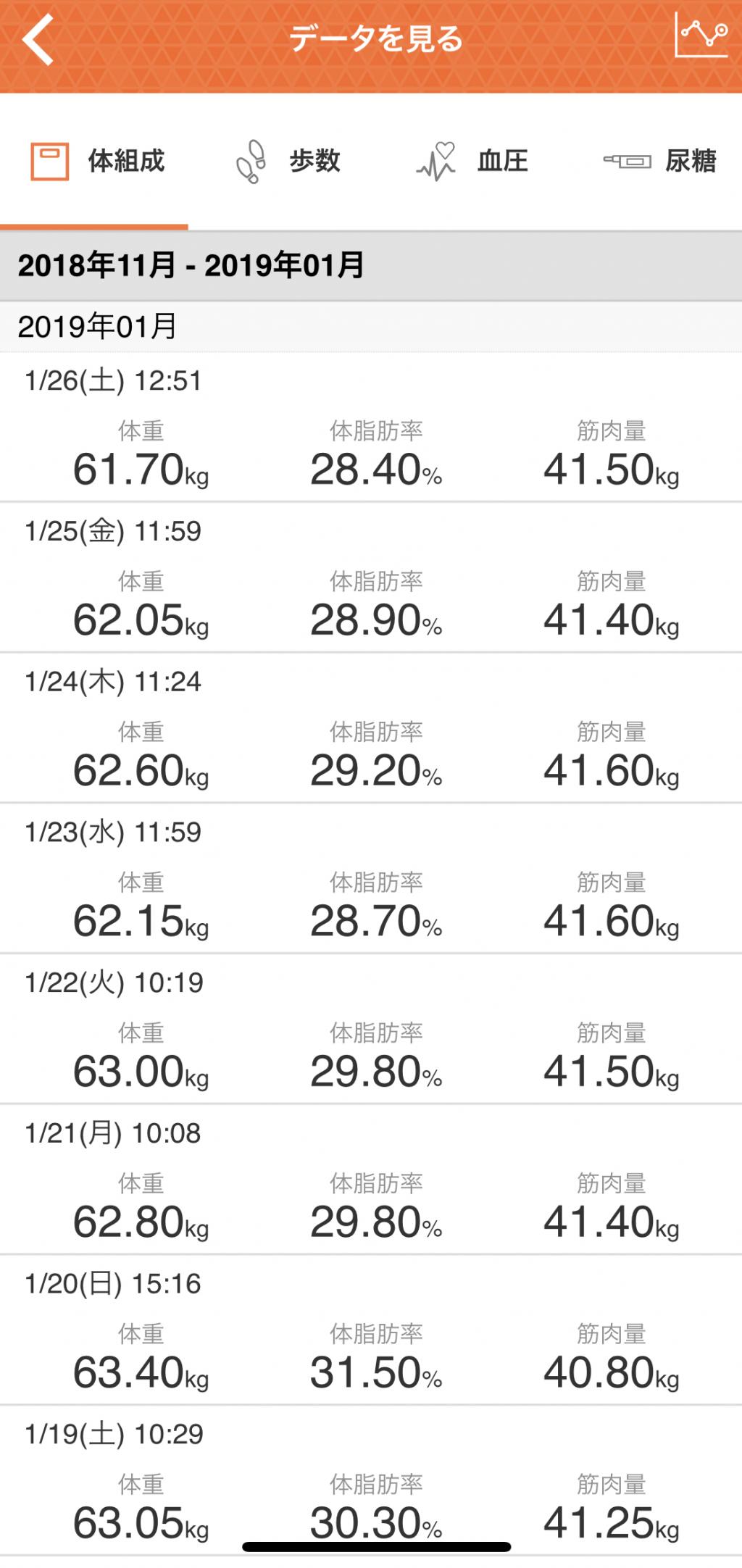 結果は体重62<-65 体脂肪率14%<-13%